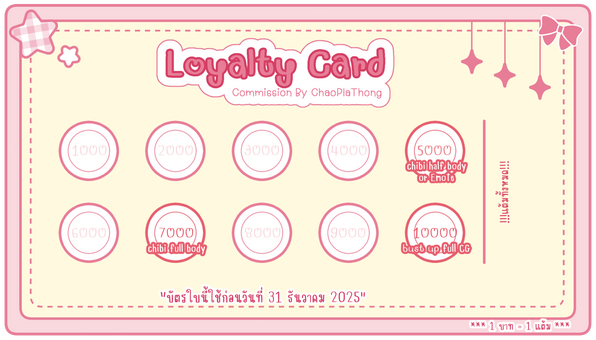 เป็นการสะสมแต้ม 1 บาท = 1 แต้ม บัตรจะหมดอายุ วันที่ 31 ธันวาคม 2025✦จ้างคอมมิชชั่นเจ้าปลาสะสมครบตามจำนวนรับฟรีไปเลย